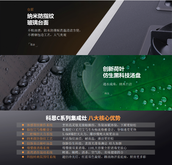 值得一提的是科恩C系列集成灶在用戶(hù)最為犯難的清潔打理方面也頗為用心,全系采用納米防指紋玻璃臺(tái)面,不沾油漬,防水防滑耐高溫,清潔尤為便捷,臺(tái)面四周為不銹鋼包邊工藝,不僅外觀美觀大氣,而且可以有效防止湯汁滲漏滴落至地面,從而杜絕滑倒等意外情況的發(fā)生。另外,湯盤(pán)采用的是創(chuàng)新荷葉仿生黑科技湯盤(pán),納米自潔,滴油不沾,遇水成珠!不難想象,在擁有如此黑科技的集成灶上烹制美食,該是一種多么難以言喻的放松和愜意!