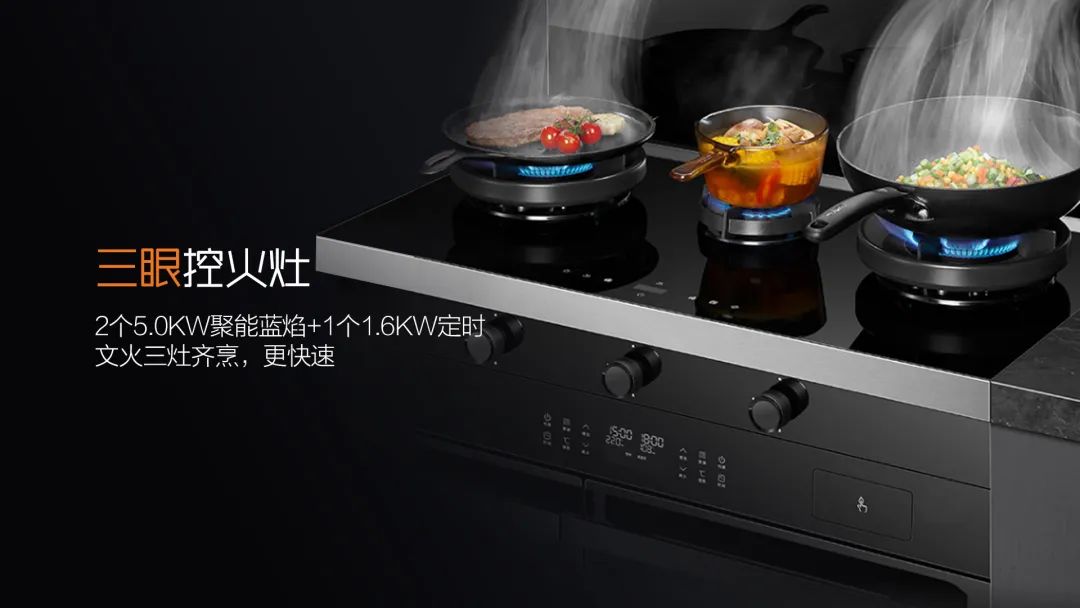 科恩A3系列獨特的三眼控火灶設置,可完美適配三代同堂家庭,2個5.0KW聚能藍焰+1個1.6KW定時文火,同時滿足爆炒和煮輔食的需求。且1.6KW小火慢煮,讓輔食擁有自己的專屬火力,無需費力調(diào)整,開啟就是最佳火力。