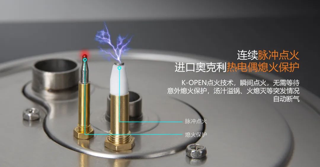 奧克利熄火針,意外熄火保護,湯汁溢鍋、火熄滅等自動斷氣,保障廚房安全。連續(xù)脈沖點火,瞬間點火,無需等待。