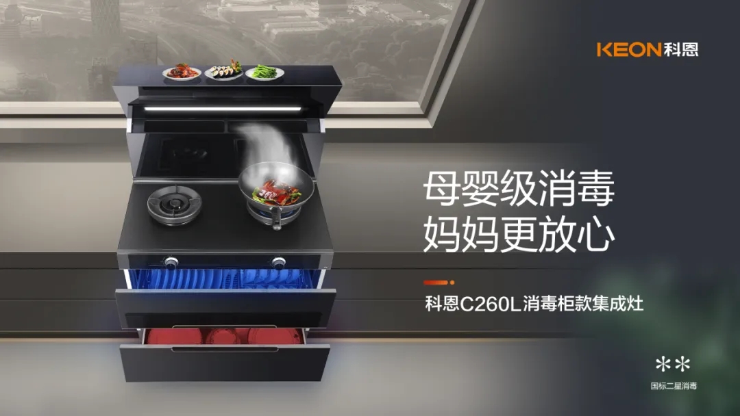 因此,為了小寶貝的健康,這款科恩C260L消毒柜款集成灶,推薦給您!不僅一臺頂多臺,且國標(biāo)二星消毒,能消殺更多細(xì)菌。