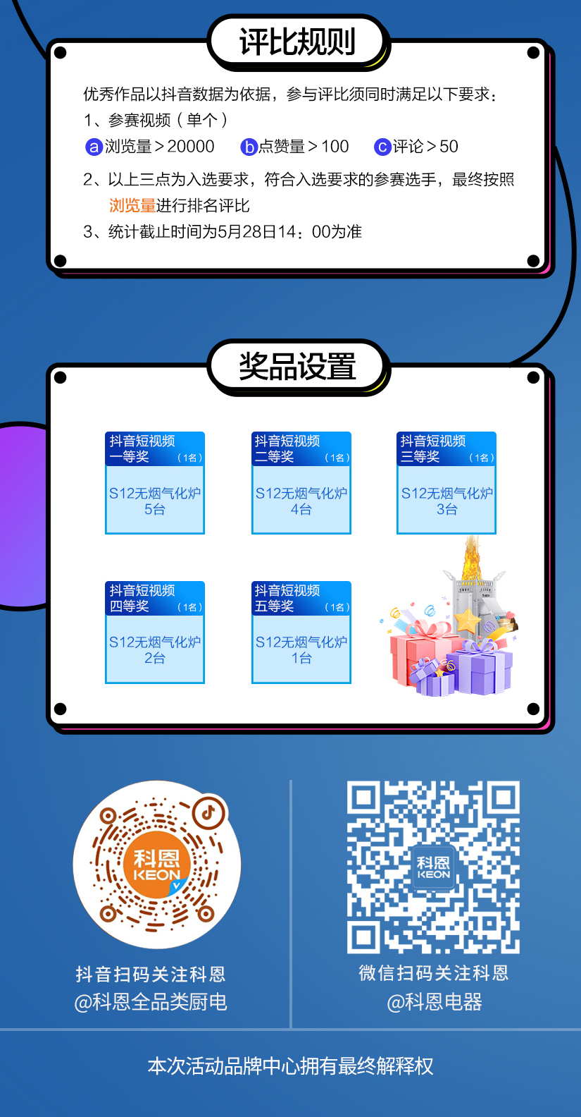 五月的煙火氣,藏在小龍蝦肥美的蝦鉗里,藏在氣化爐的勁焰猛火中,爐力全開,鉗動(dòng)江湖。5 月12日——5月26日,一場舌尖與視覺的雙重盛宴拉開序幕!科恩龍蝦節(jié)抖音短視頻PK大賽重磅來襲,誠邀全國科恩專賣店,共赴這場創(chuàng)意與實(shí)力的較量,用鏡頭記錄無煙料理的無限可能。