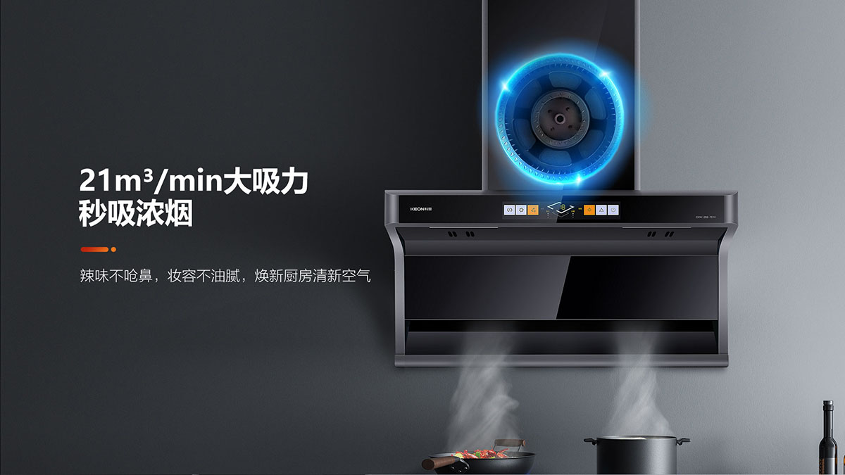- 21m3/min颶風(fēng)吸力,瞬吸濃煙,辣味不嗆鼻,煥新廚房清新空氣