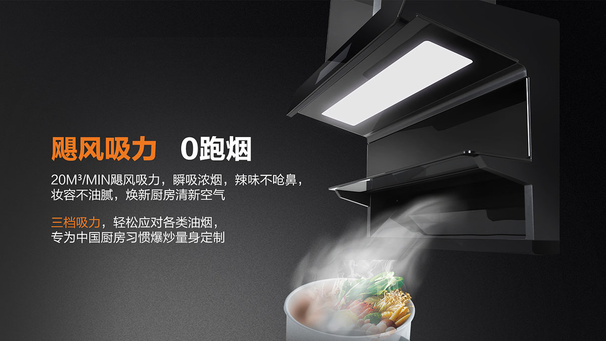 - 獨(dú)特黃金吸煙角,二次冷凝板內(nèi)傾設(shè)計(jì),油煙不過(guò)臉