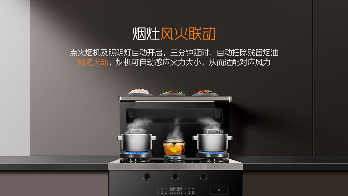 - 煙灶風火聯(lián)動,點火煙機及照明燈自動開啟,風量隨火力大小自動調(diào)節(jié)