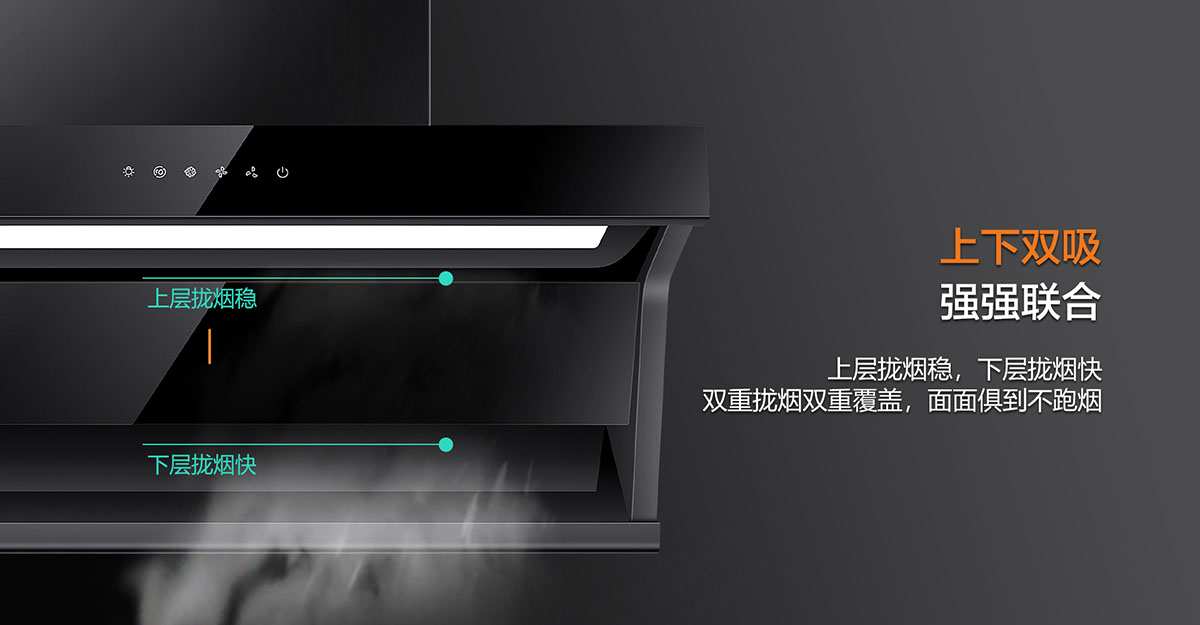 - 上下雙吸,下強(qiáng)吸,上快攏,強(qiáng)強(qiáng)聯(lián)合,油煙0逃逸