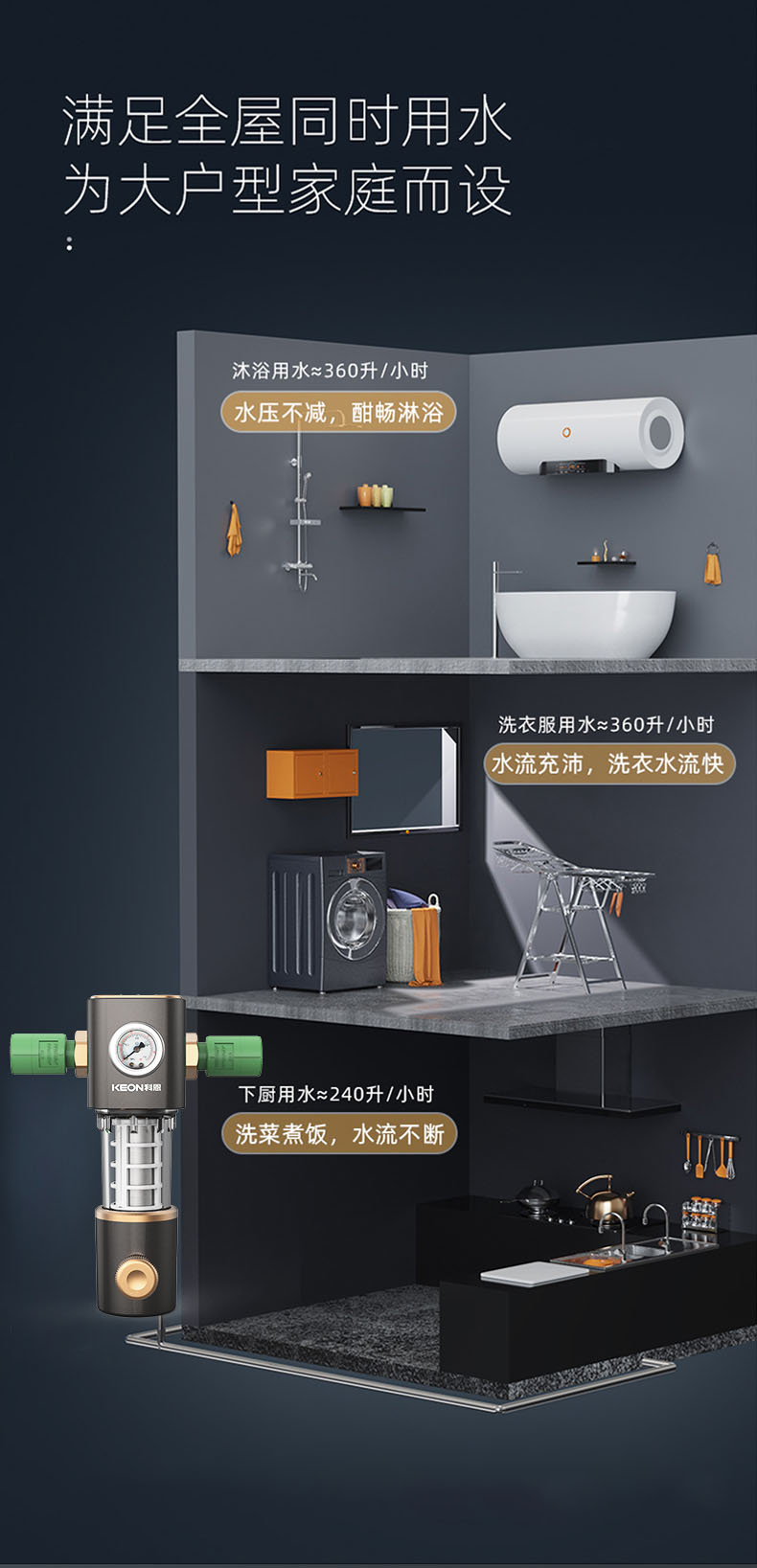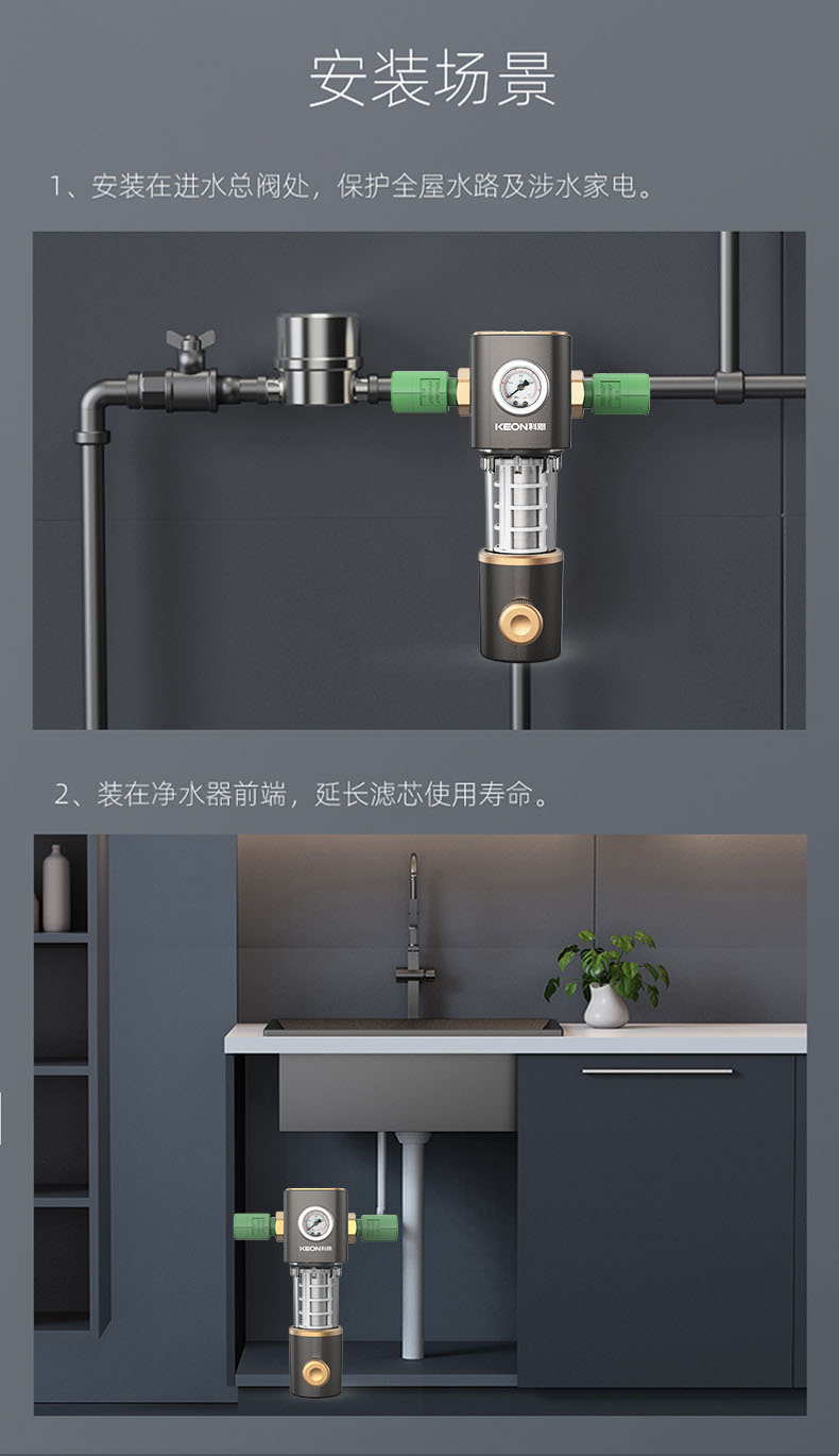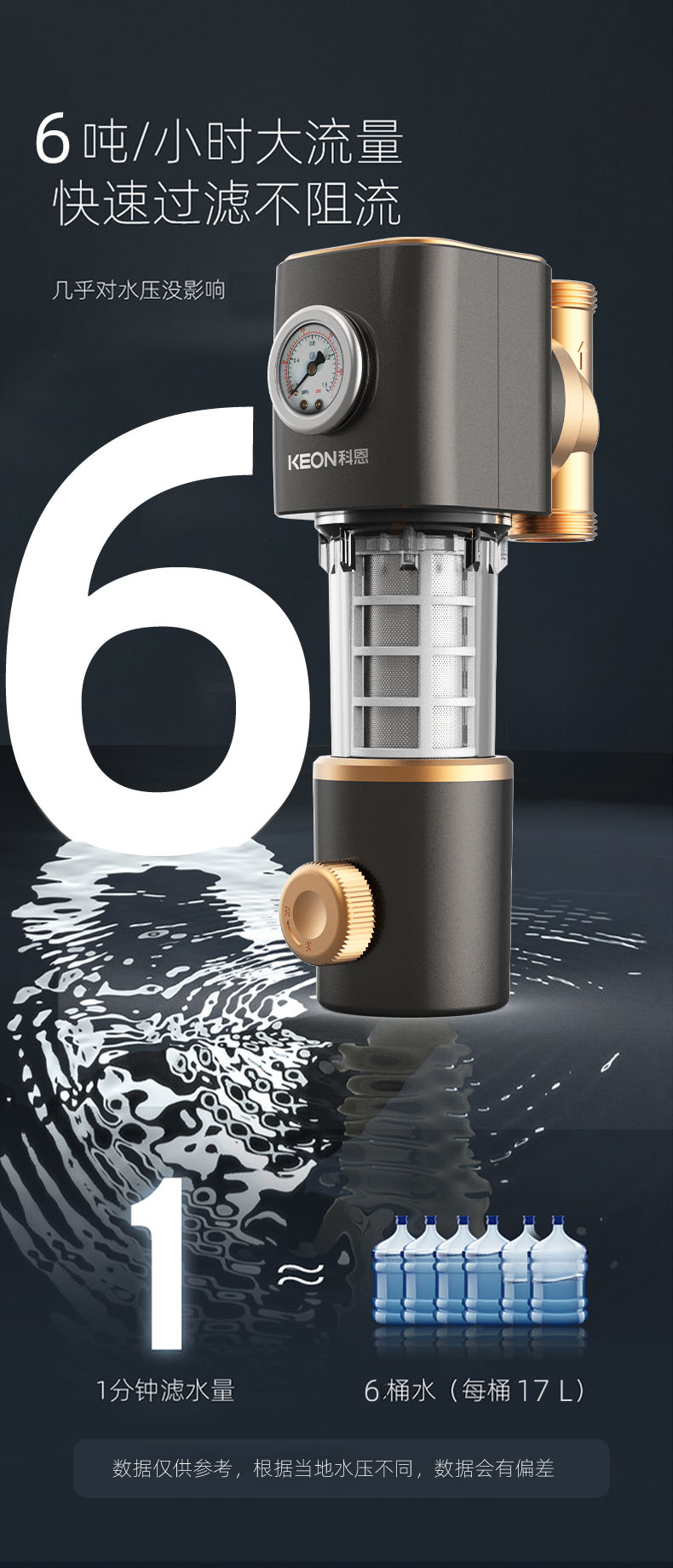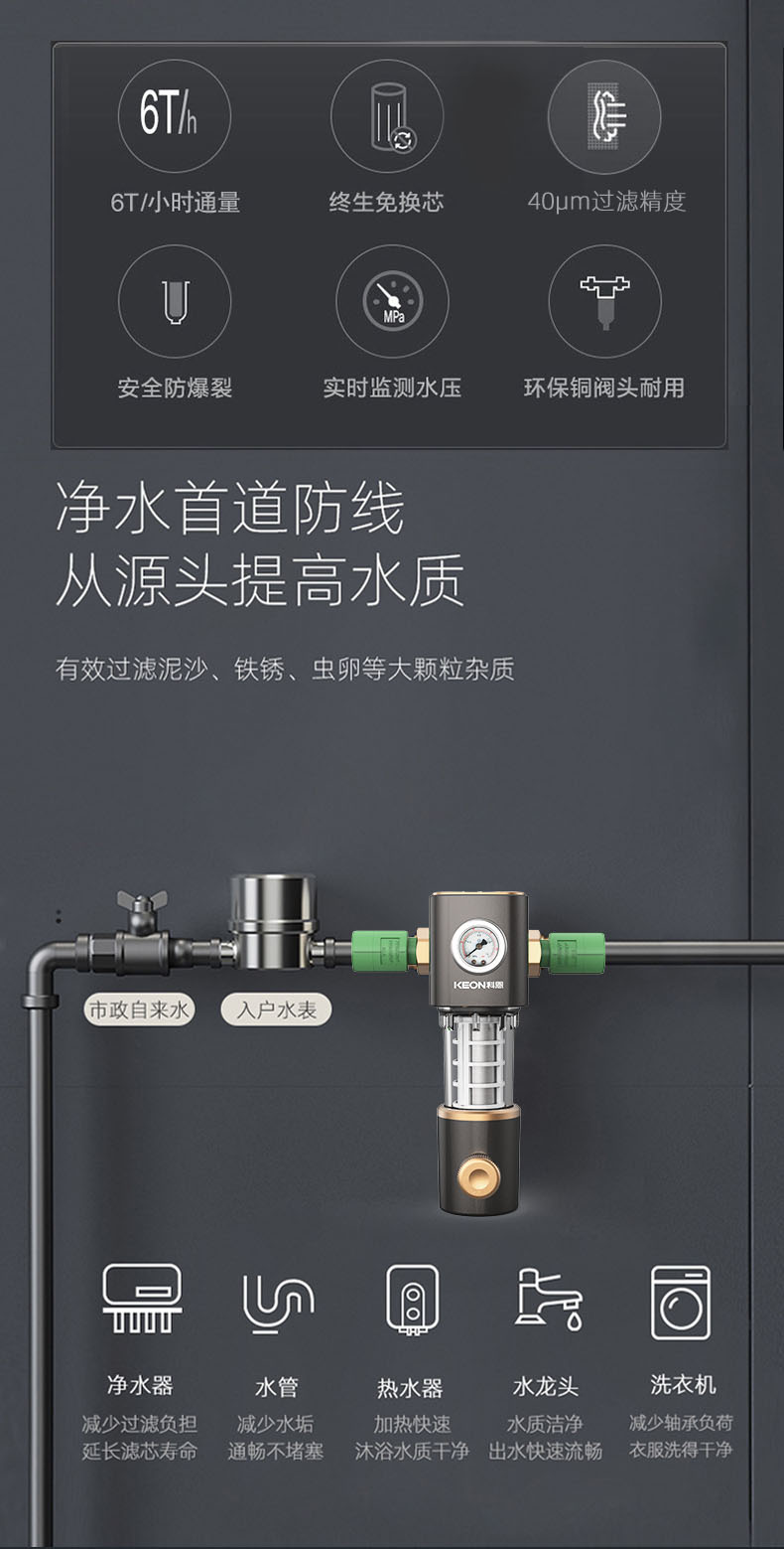 - 6噸/小時(shí)大流量,快速過濾,全屋用水無壓力