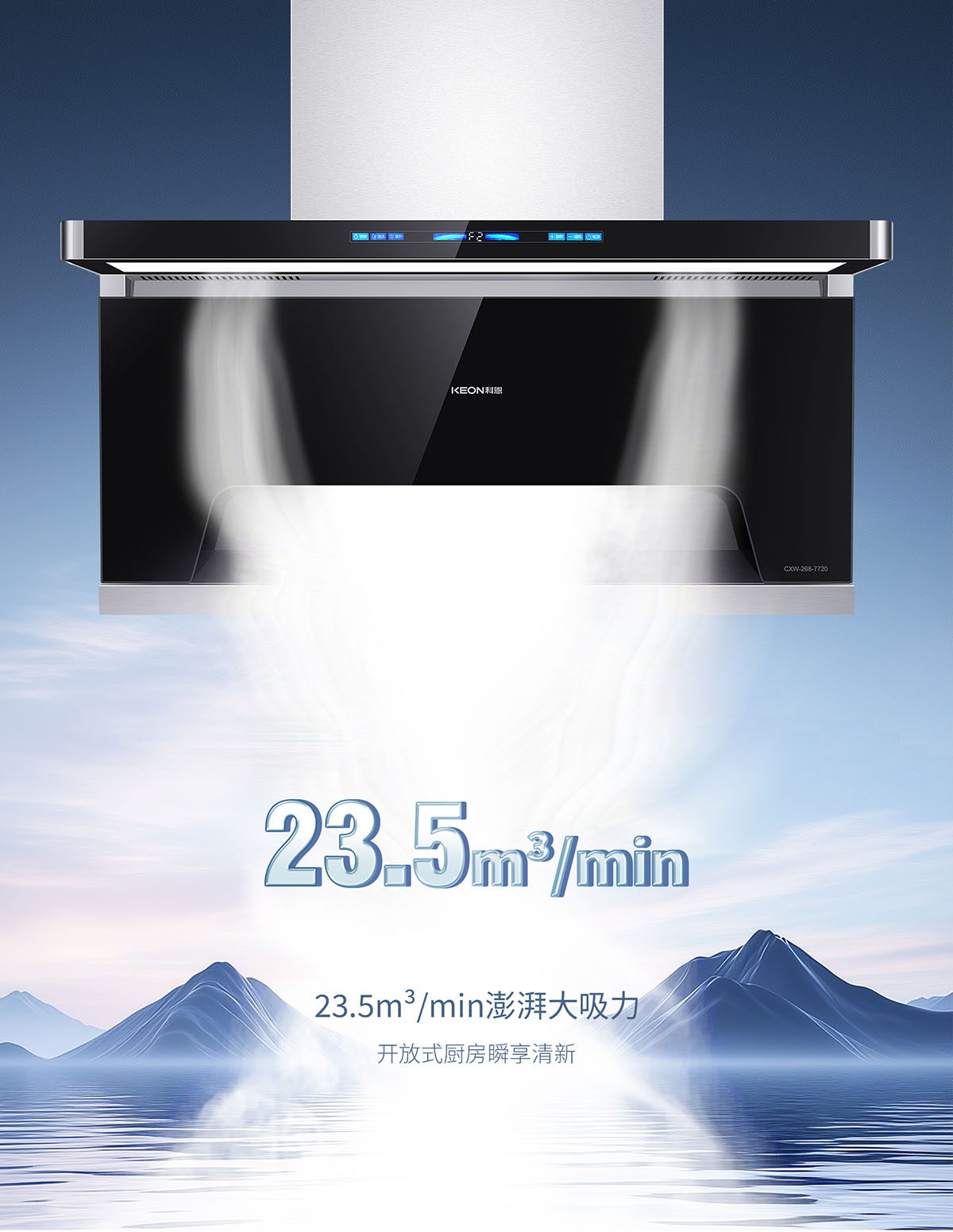 - 一鍵23.5m³/min爆炒大吸力,無懼重油爆炒