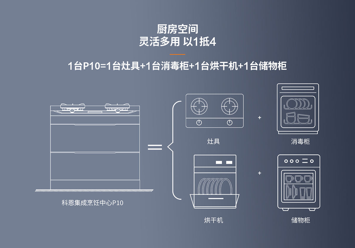 - 以1抵4,1臺P10=1臺灶具+1臺消毒柜+1臺烘干機+1臺儲物柜