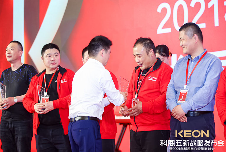 來(lái)自全國(guó)各地的獲獎(jiǎng)經(jīng)銷商登臺(tái),雙手接下榮譽(yù)獎(jiǎng)?wù)?,這份榮譽(yù)代表著他們堅(jiān)守著不變的信念,對(duì)科恩事業(yè)永遠(yuǎn)保持熱忱之心,行動(dòng)和成績(jī)是他們給予的優(yōu)秀答卷??贫麟娖靼l(fā)展至今,離不開(kāi)全國(guó)所有經(jīng)銷商們的共同努力,同心同行、攜手再創(chuàng)下一個(gè)黃金十年!