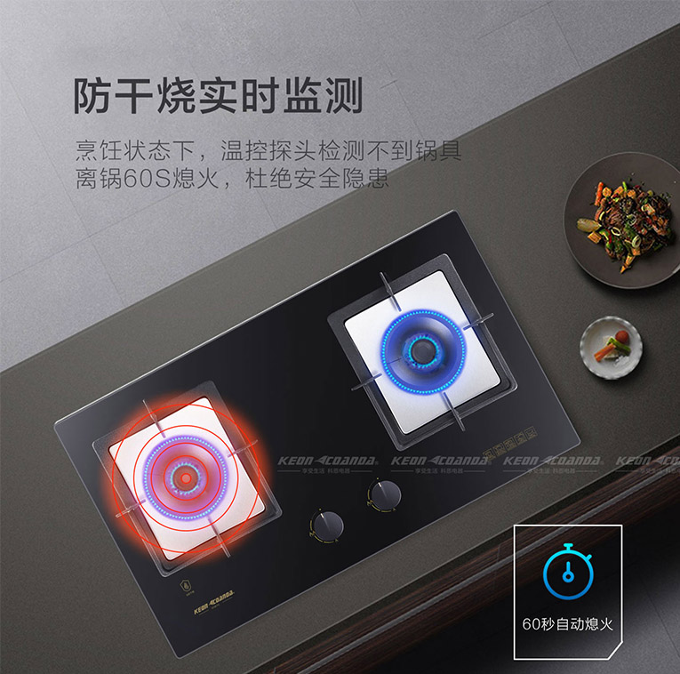 說起防干燒,其實(shí)是燃?xì)庠钕ɑ鸨Wo(hù)裝置的一大技術(shù)突破,防干燒技術(shù)則是采用溫控傳感器和熱敏電阻感應(yīng)的方式,搭配實(shí)時(shí)監(jiān)測功能,這樣在使用時(shí)更顯智能化和人性化。相比市面上普通防干燒灶具,集成灶十大品牌、廚電行業(yè)十大品牌科恩KN610智能防干燒灶具技術(shù)更為優(yōu)越,在溫度檢測上,普通防干燒在超過298℃后才能啟動(dòng)熄火保護(hù),而KN610在溫度達(dá)到280℃時(shí)就能斷氣,另外,烹飪狀態(tài)下,溫控探頭檢測不到鍋具60S時(shí)也將自動(dòng)熄火,有效杜絕了安全隱患!