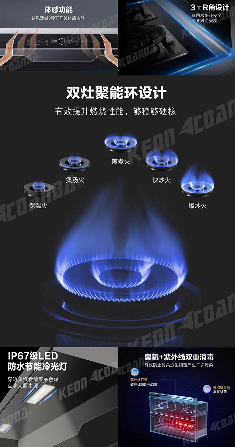 520告白季,科恩D520煙灶消款集成灶前來助陣,低空近吸體感操控,按風(fēng)俗健3秒可開關(guān)體感功能,3πR角設(shè)計(jì),既防水保證安全,又顯高端時(shí)尚,雙灶聚能環(huán)5.0KW強(qiáng)大火力,爆炒更有勁,煲湯更有味,1-99分鐘自由選擇,烹飪完成時(shí)自動(dòng)熄火,開關(guān)紅外線2秒延時(shí),防止了誤觸,同時(shí)產(chǎn)品采用一鍵自動(dòng)清洗,減輕你美麗雙手負(fù)擔(dān),內(nèi)部一鍵自動(dòng)清潔。消毒柜采用臭氧+紫外線雙重消毒,有效防止了餐具滋生細(xì)菌產(chǎn)生的二次污染,西門子冰箱門拉手,貼心高氧化鈦合金材質(zhì),耐用又好看!愛她,就要保護(hù)她,科恩D520集成灶,給她全方位的守護(hù)!