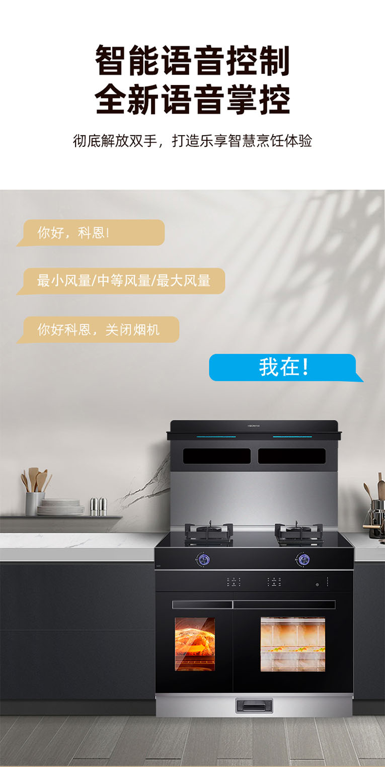 科恩集成灶本次新品發(fā)布最大的亮點(diǎn)在于S450左右蒸烤集成灶,隨著生活的不斷提高,節(jié)奏也在加快,對(duì)廚房的要求也越來(lái)越智能化、便捷化,廚房體驗(yàn)更偏向于烹飪效果、使用體驗(yàn)、效率提升以及智能操控,集成灶十大品牌、廚電行業(yè)十大品牌科恩S450集成灶滿(mǎn)足了現(xiàn)代化廚房需求。獨(dú)立空間,左右蒸烤,蒸出食材原先,烤出鮮嫩多汁,同時(shí)操作蒸烤同步,改變了以往蒸烤單獨(dú)進(jìn)行的運(yùn)轉(zhuǎn)模式。S450左右蒸烤集成灶還擁有智能語(yǔ)音控制,徹底解放雙手,打造樂(lè)享智慧烹飪體驗(yàn),