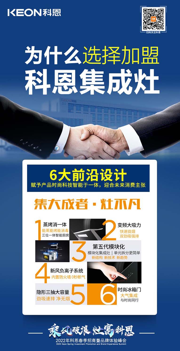 “乘風(fēng)破浪,灶富科恩”2022科恩春季招商暨品牌體驗峰會將于3月18日舉行,選擇大于努力,抓住時代機(jī)遇!集成灶十大品牌、廚電行業(yè)十大品牌科恩集成灶具備優(yōu)于業(yè)界的技術(shù)、高質(zhì)量的保證、強(qiáng)大的企業(yè)實力、有保障的售后等優(yōu)勢,實力加盟的不錯之選。