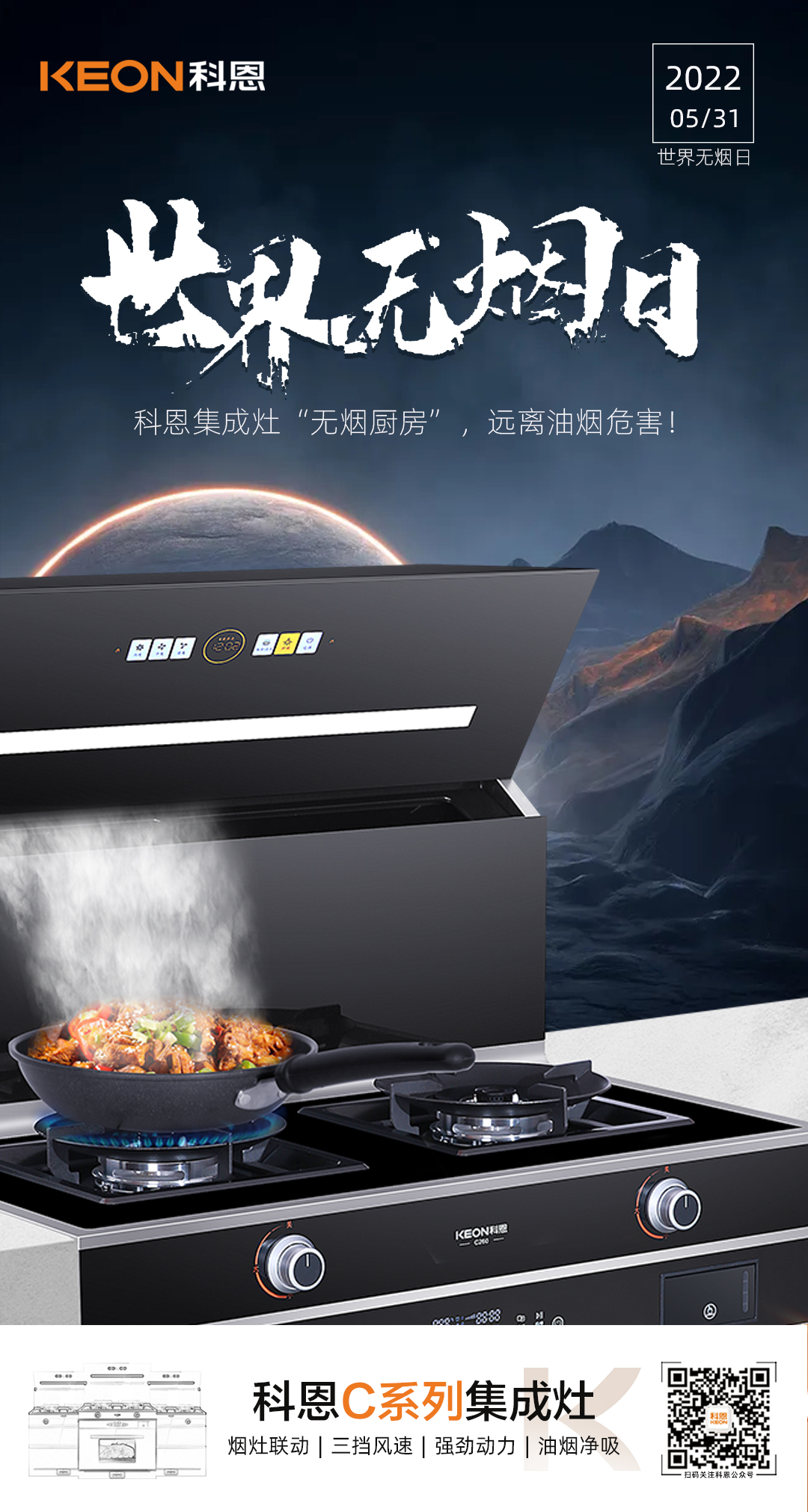 吸煙有害健康已是不爭的事實,近年來大家對于香煙危害已極為重視,但卻鮮少有人知道,其實廚房油煙比煙草危害來得更悄無聲息,特別是在喜歡熱油爆炒的中國家庭,油煙已然一躍成為影響健康的頭號隱形殺手 !告別油煙困擾,遠離油煙綜合征,你需要一臺科恩C260蒸烤消炸集成灶,陪你度過猛火爆炒油煙不過臉的每一天,有了TA,天天都是無煙日!