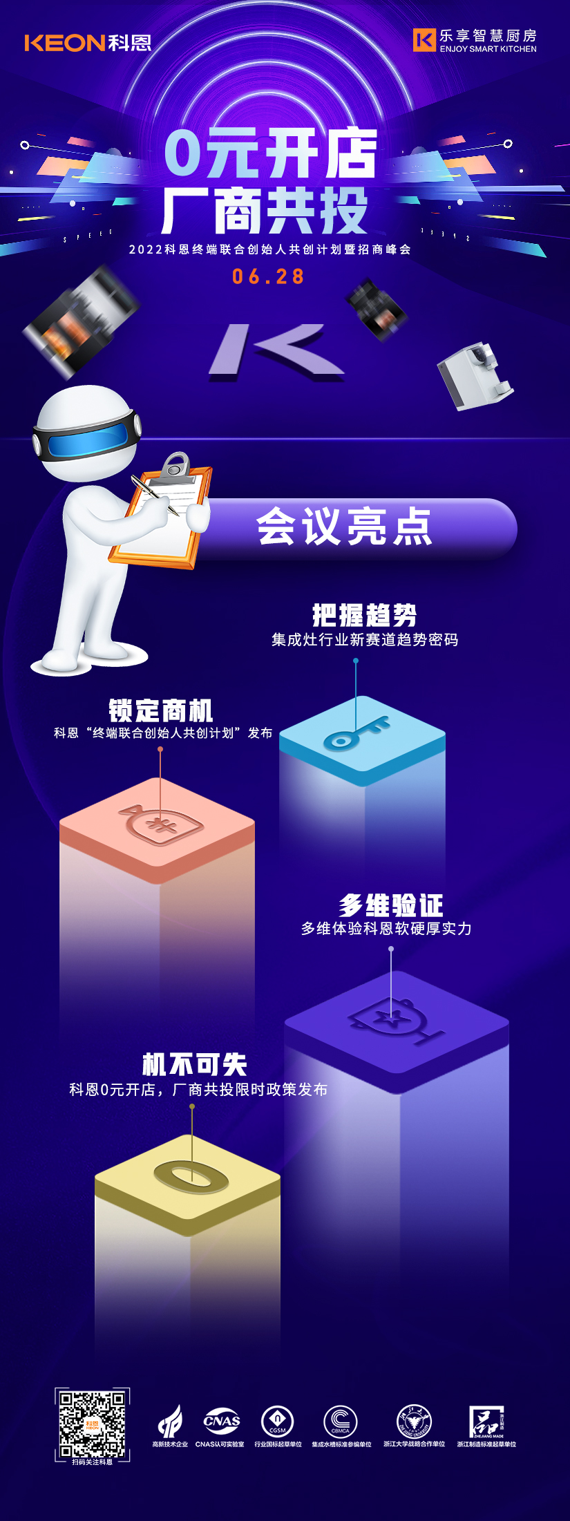 6月28日2022科恩終端聯(lián)合創(chuàng)始人共創(chuàng)計(jì)劃暨招商峰會(huì)將在廚具之都嵊州隆重舉辦,本次峰會(huì)將以“0元開店,廠商共投”為主題,邀請(qǐng)來自全國各地的行業(yè)精英、投資大佬匯聚一堂,共同探討廚電行業(yè)發(fā)展趨勢(shì),解鎖集成灶行業(yè)新賽道趨勢(shì)密碼,多維驗(yàn)證科恩集團(tuán)軟硬厚實(shí)力,屆時(shí),將為各位來賓解讀限時(shí)政策內(nèi)容,為各位投資人提供一個(gè)潛力無限,共創(chuàng)霸業(yè)的優(yōu)秀共創(chuàng)平臺(tái)。