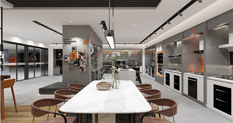 科恩新門店簡約、大氣、精美的視覺沖擊讓人印象深刻,開放式瀏覽路徑,通過“視覺+產(chǎn)品+體驗”的融合,以差異化彰顯品牌個性,讓消費者通過感知產(chǎn)品來感受品牌,對多個區(qū)域進行場景重構(gòu),產(chǎn)品陳列區(qū)、廚房場景、品牌背書、洽談區(qū)等,通過模塊化的方式,將核心產(chǎn)品模塊以及開放式廚房體驗場景植入門店,體現(xiàn)了更具應用價值的“新潮牌”!