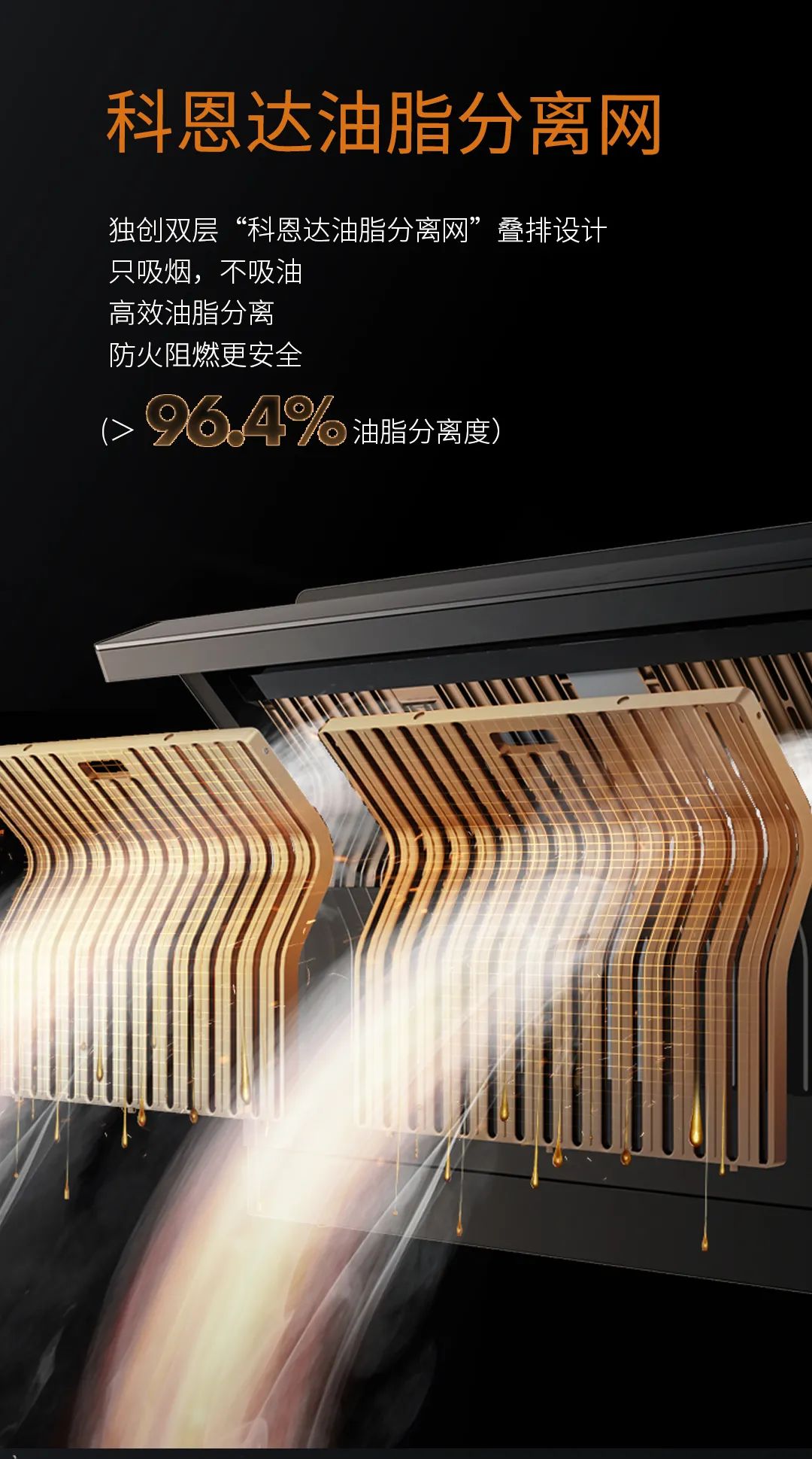6K省心超體驗二:科學設計免清洗,耐用省心!科恩達油脂分離網(wǎng)完美實現(xiàn)煙機免清洗??贫鬟_油脂分離網(wǎng)可實現(xiàn)高效油脂分離,油脂分離率>96%,實現(xiàn)油脂不進門,煙機免清洗的理想狀態(tài)。